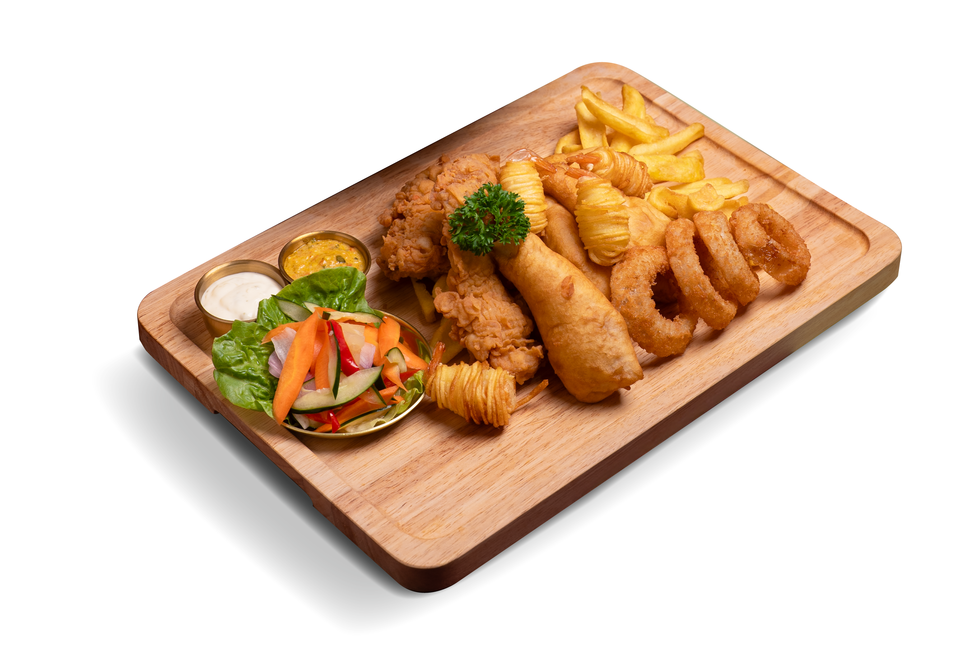 A joyful spread made for reunion moments. Golden fish fillets, crunchy potato shrimps and the signature fried Ayam Masak Merah come together with onion rings and fries. Served with homemade achar, sambal merah mayo and tartar sauce. Perfect for sharing among 3 to 4.