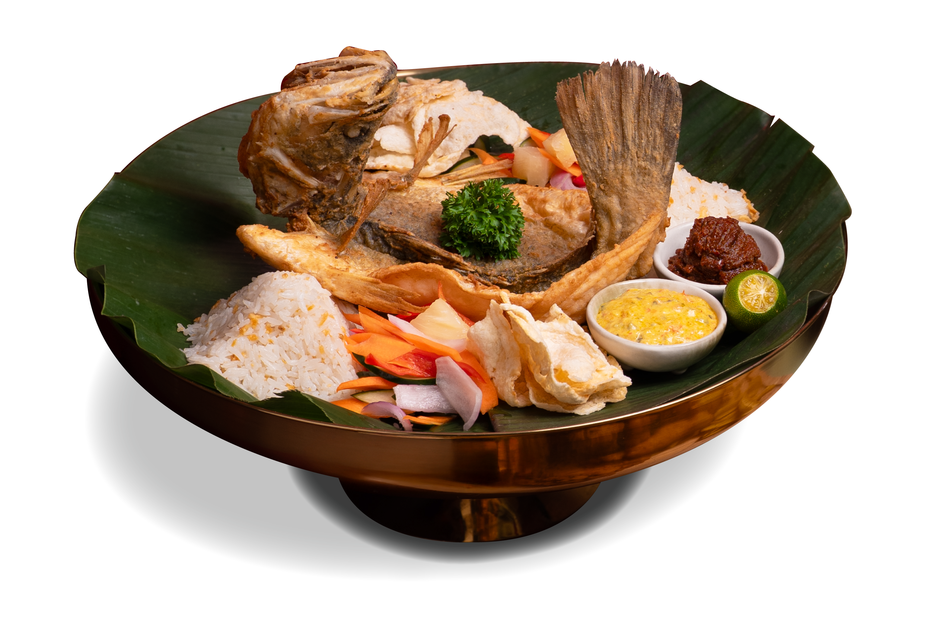 A symbol of abundance for festive feasting. Whole deep-fried seabass served with fragrant garlic rice, crisp emping belinjo, homemade achar, sambal belacan and sambal merah mayo. Ideal for sharing between 2.