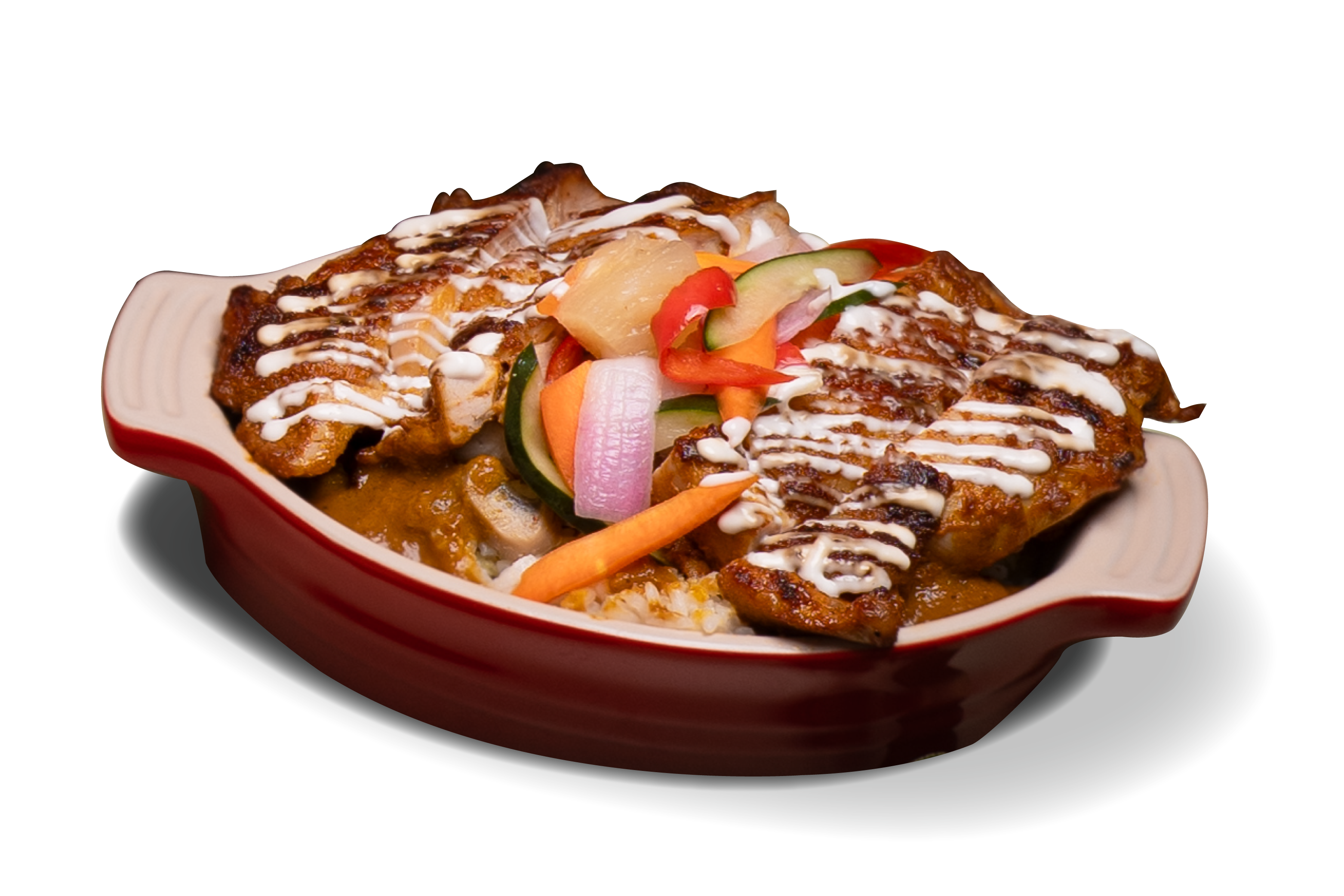 Comfort with a festive twist. Oven-baked savory rice topped with grilled boneless chicken leg, rich curry flavors, homemade achar and a drizzle of coconut mayo for a creamy finish.